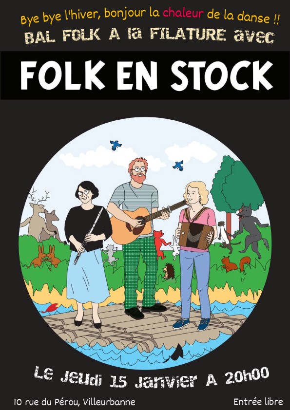 Folk en Stock, c’est un trio lyonnais qui revisite les différents répertoires des musiques traditionnelles à danser, ou juste à écouter : en Janvier, venez chasser les frimas de l’hiver (ou peut-être aussi les calories accumulées pendant les fêtes ?!), au rythme endiablé des mazurkas, valses, scottishes et autres polkas !